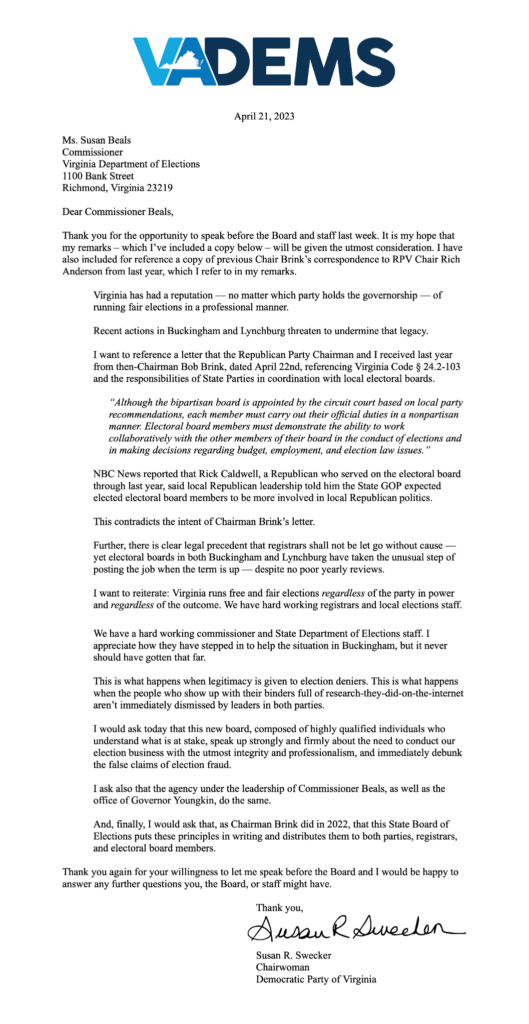 I want to reference a letter that the Republican Party Chairman and I received last year from then-Chairman Bob Brink, dated April 22nd, referencing Virginia Code § 24.2-103 and the responsibilities of State Parties in coordination with local electoral boards.