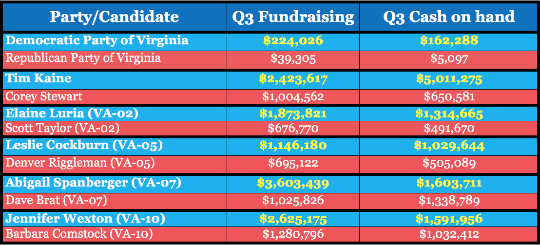 The Democratic Party of Virginia holds an over 32:1 cash on hand advantage over the Republican Party of Virginia, Senator Tim Kaine had over 7 times as much cash on hand as Corey Stewart, and all four Democrat challengers hold a cash advantage in what have been rated Virginia's most competitive Congressional races.