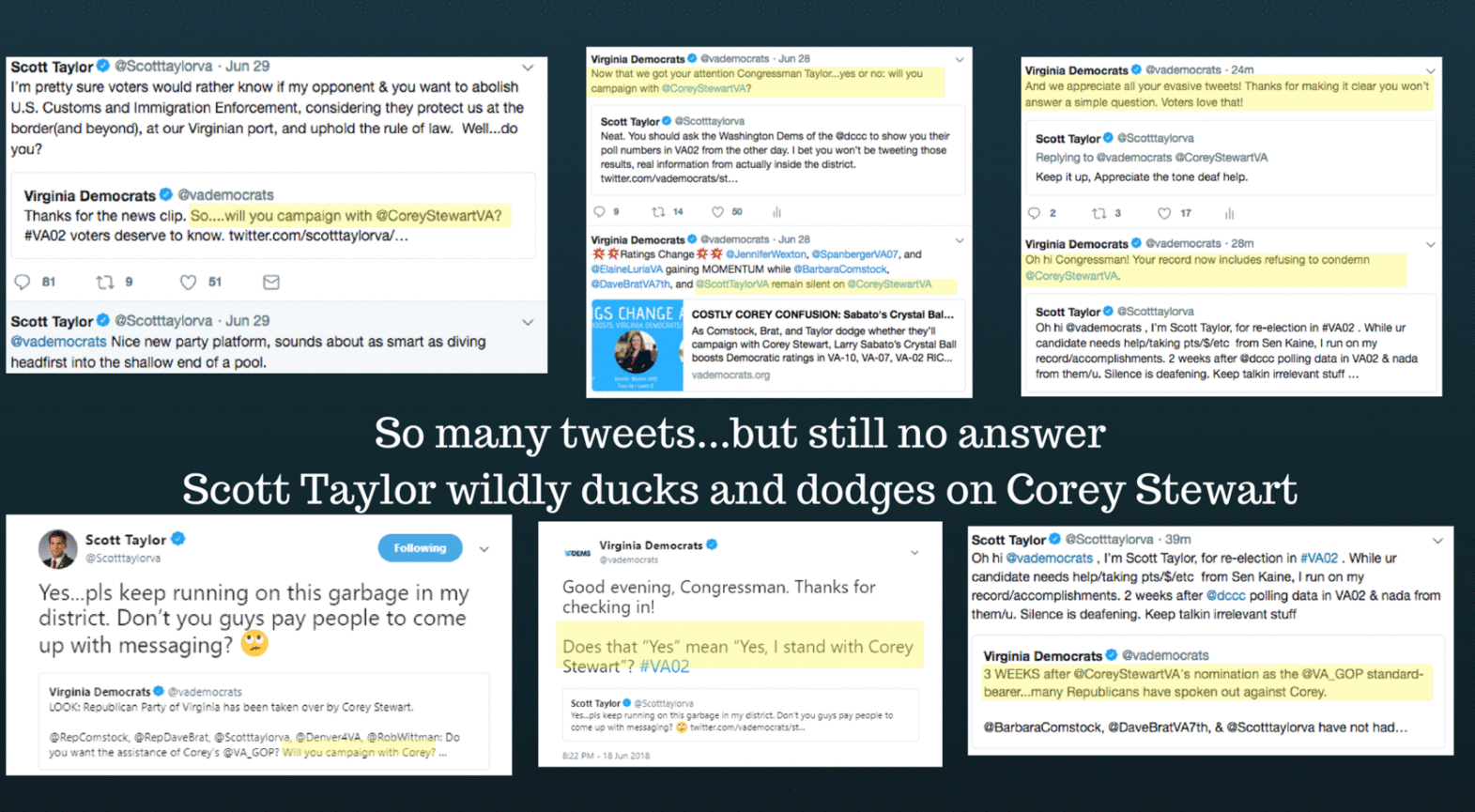 So many tweets…but still no answer. Scott Taylor wildly ducks and dodges on Corey Stewart.