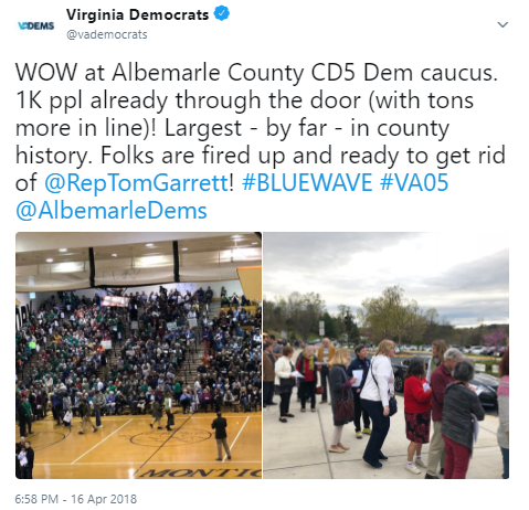 Contrasting Garrett's slide in the Cook Report ratings and incredibly radical stances, the race for the 5th District Democratic nomination has been historically energetic. The April 16th Albemarle County 5th CD Caucus saw a record 1,328 Democrats stand out in frigid temperatures for hours to support candidates all unified against booting Garrett out. Similar unprecedneted turnouts have been seen at Democratic county caucses throughout the district.