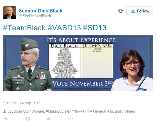 Last night, Dick Black's since-deleted braggadocious tweet managed to lob an unfair and sexist attack on working mothers everywhere. By listing an extensive array of pursuits in comparison to his opponent, pediatrician Dr. Jill McCabe, Black sought to paint himself as more accomplished, citing such activities as being a "herpetologist" while downplaying McCabe's role as a mother. And a doctor. And a small business owner. And many of the other ways she spends her time -- not listed by Black, of course.