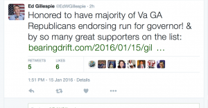Text of Tweet: Honored to have majority of Va GA Republicans endorsing run for governor! & by so many great supporters on the list: http://bearingdrift.com/2016/01/15/gillespie-rolls-out-massive-endorsement-list/